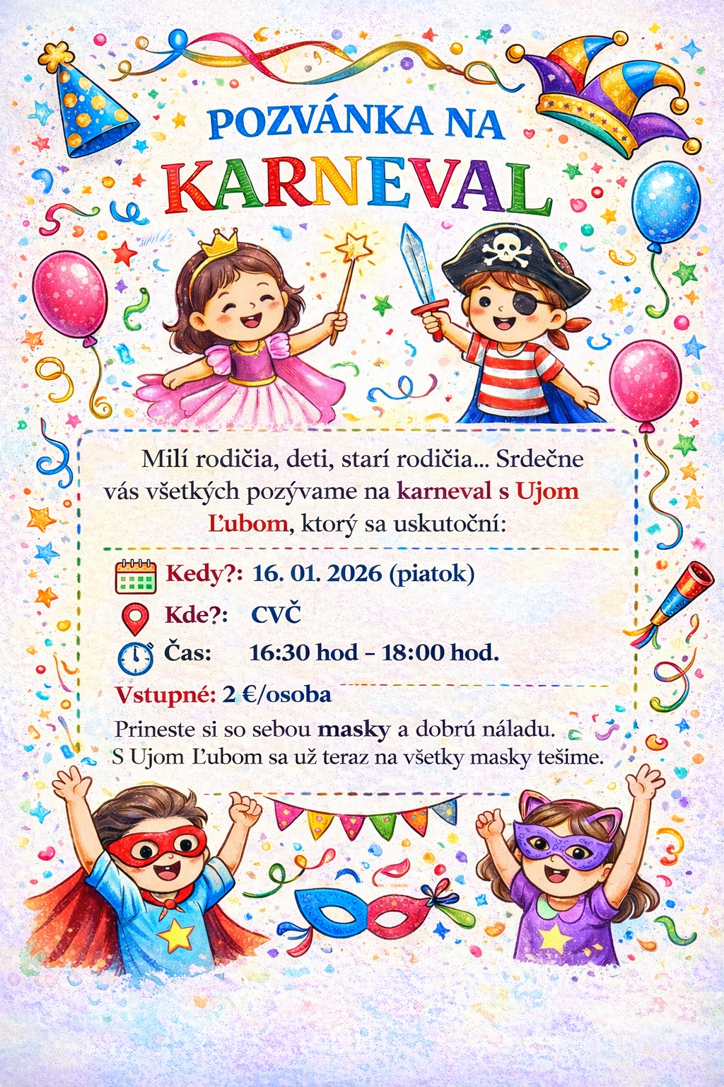 Srdečne vás pozývame všetkých, deti, rodičov, starých rodičov……, na karneval s Ujom Ľubom, ktorý sa uskutoční: Kedy: 16. 01. 2026