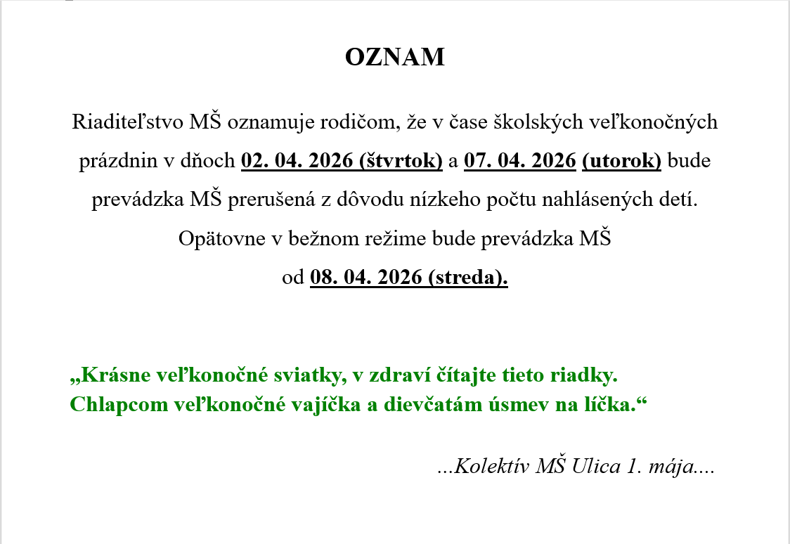 OZNAM Riaditeľstvo MŠ oznamuje rodičom, že v čase školských veľkonočných prázdnin v dňoch 02. 04. 2026 (štvrtok) a 07. 04. 2026